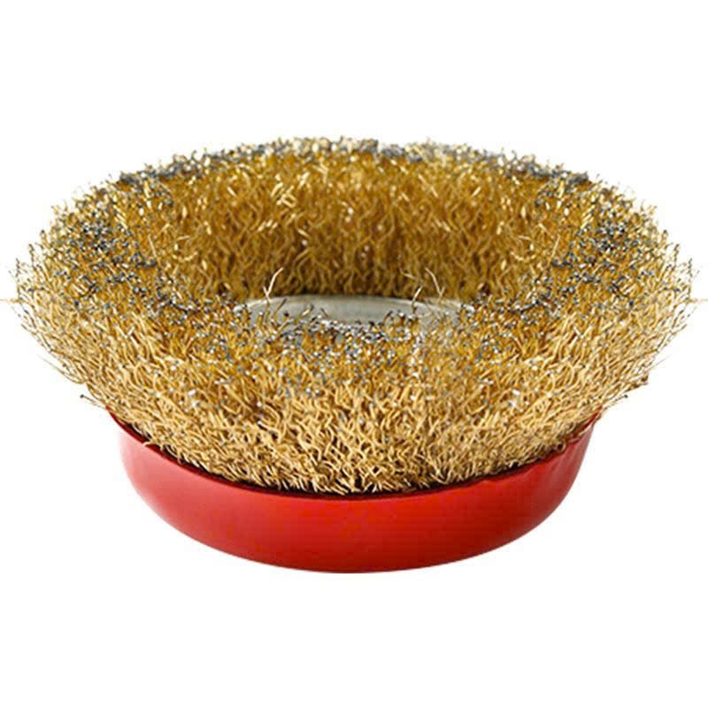Chổi đánh rỉ sắt sợi đồng, chén cước đường kính 90mm, bát rỉ sét lỗ trục 16mm lắp máy mài cầm tay